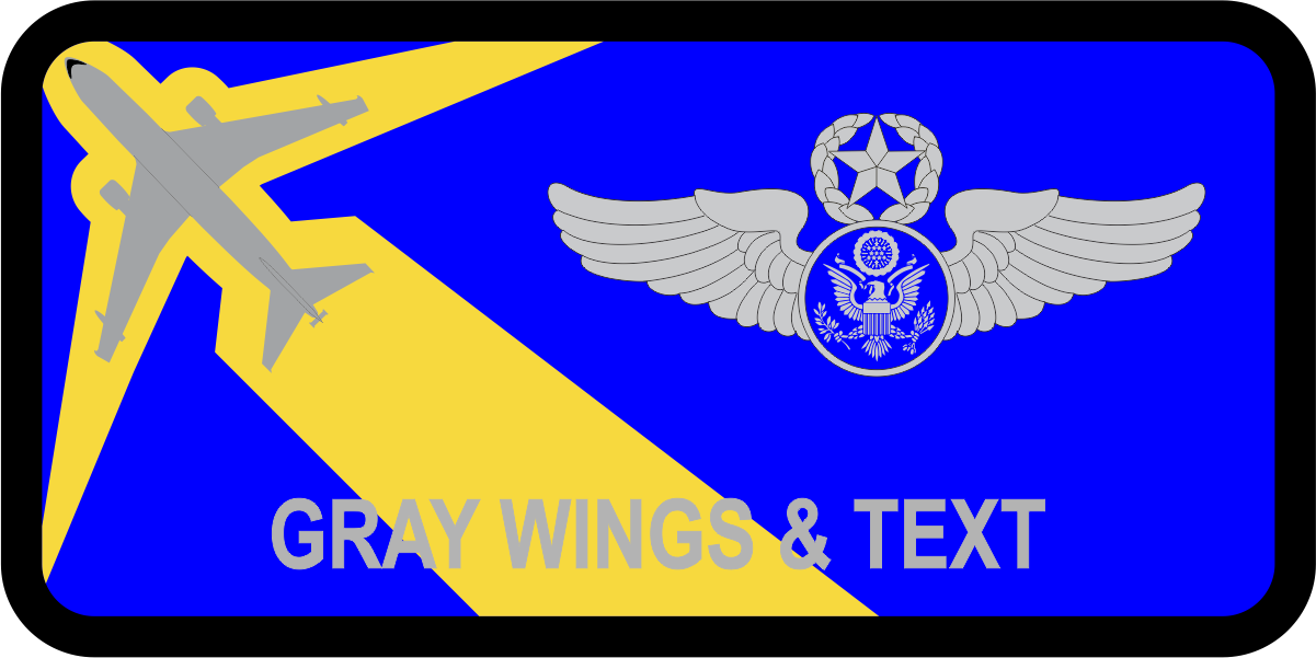 Travis AFB 6 ARS KC-46 Name Tag- Blue Background, Black Border, Yellow Landing Stripe, Gray KC-46, Gray Wings & Text - Optional Leather Backing