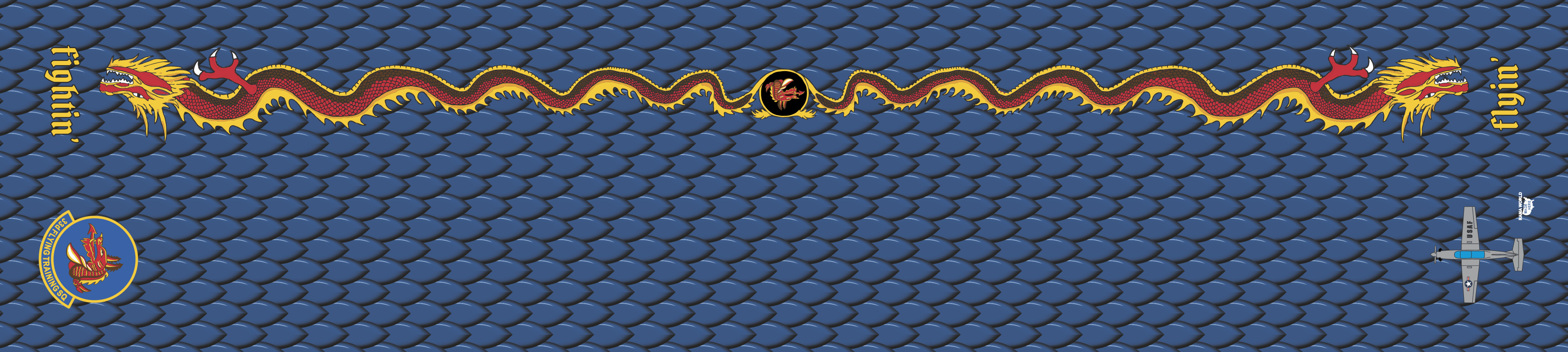 Vance AFB 33 FTS Blue Scarf with chinese dragon with patch on left side and aircraft on the right side. Size: 5" x 48".