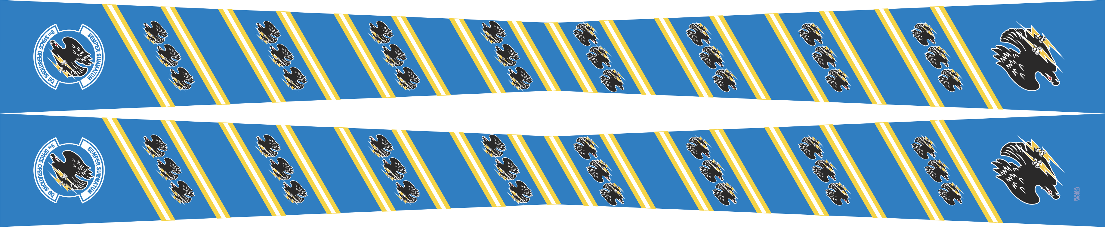 Vandenberg AFB 9 SOPS Flight Scarf. Blue Background With White and Yellow Stripes With Black Hawk Emblem Throughout and SQ Patch On The Ends Of The Scarf. Size: 4" x 2" x 4" x 48".