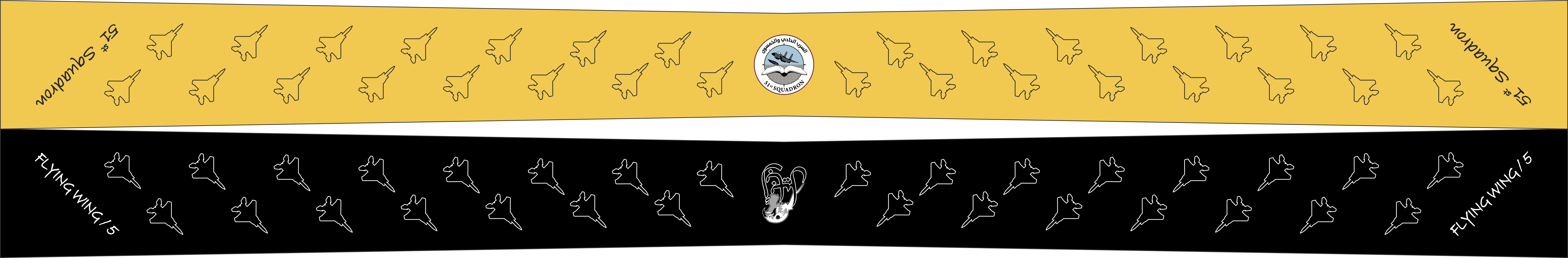 Beoing Company 51 SQ Yellow & Black Scarf With F-15 Aircraft Pattern Through Out The Scarf, "51st Squadron" Text On The Ends Of The Yellow Side Scarf & "Flying Wing / 5" On The Ends Of The Black Side Of The Scarf, 51st SQ Patch In The Center Of The Yellow Side & Eagle Emblem In The Center Of The Black Side. Size: 4" x 3" x 4" x 60"