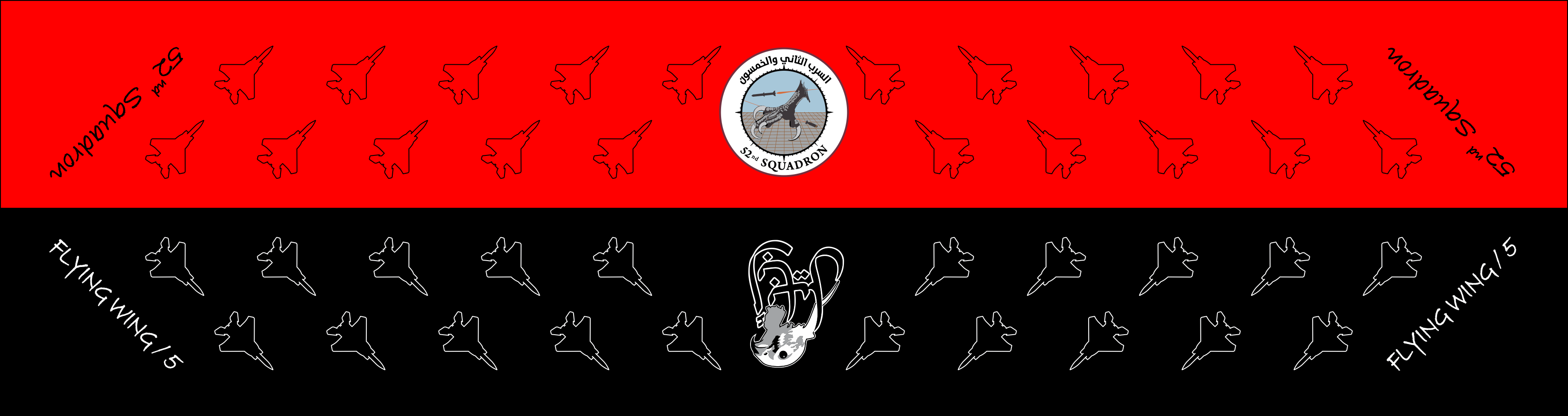 Beoing Company 52 SQ Red & Black Scarf With F-15 Aircraft Pattern Through Out The Scarf, "52nd Squadron" Text On The Ends Of The Red Side Scarf & "Flying Wing / 5" On The Ends Of The Black Side Of The Scarf, 52nd SQ Patch In The Center Of The Red Side & Eagle Emblem In The Center Of The Black Side. Size: 6" x 48" .