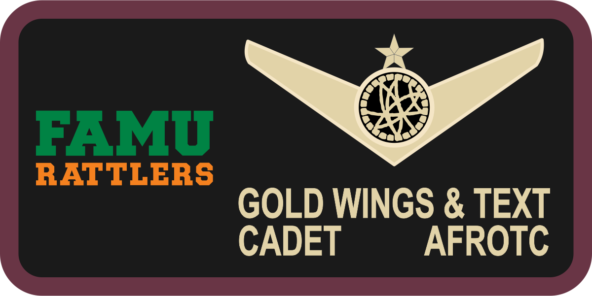 Florida State University AFROTC Det 145 Name Tag Black Background, Maroon Border, Gold Wings & Text, with FAMU Rattlers Logo on the Left