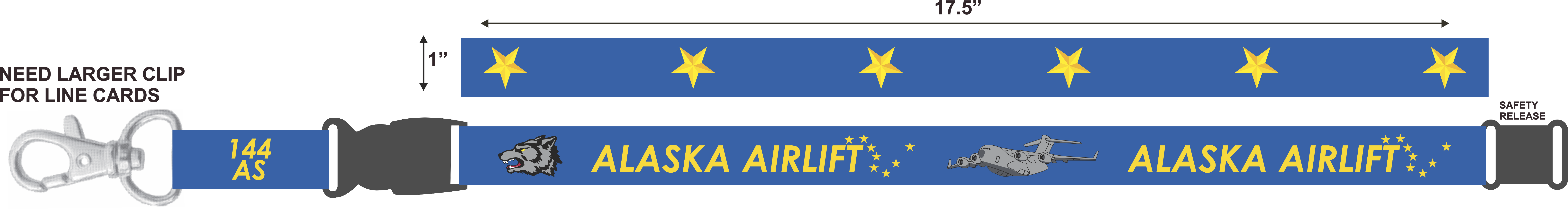 Elmendorf AFB 144 AS Lanyard with Bottle Opener - Blue Background, Yellow Stars, Alaska Airlift, Gray C-17, with Bottle Opener End with Safety Release