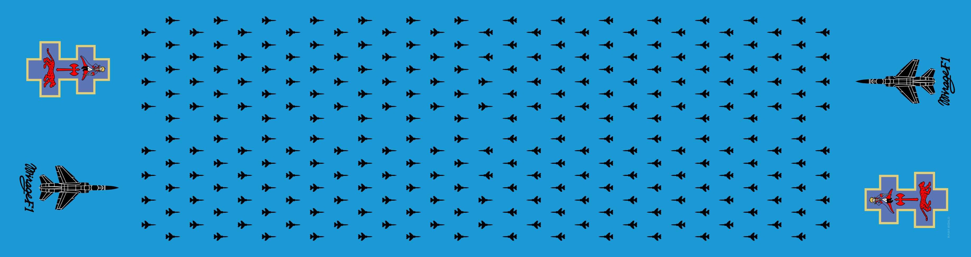 French Air Force Jean-Louis Flight Scarf - Blue body with F-1 Mirage over the body of the scarf, patches, and F-1 mirage aircraft's on both ends. Size 6" x 48"