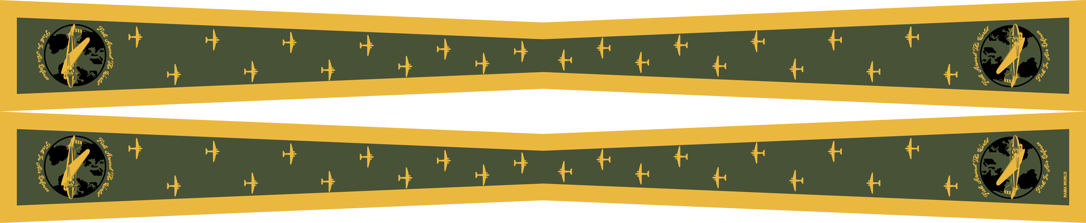 JPG.STUDIOS C-47 Flight Scarf. Gold Trim With OD Green Background, C-47 Top View Pattern, and "First Around The World.." Logo on the ends of the Scarf. Size: 4" x 2" x 4" x 48".