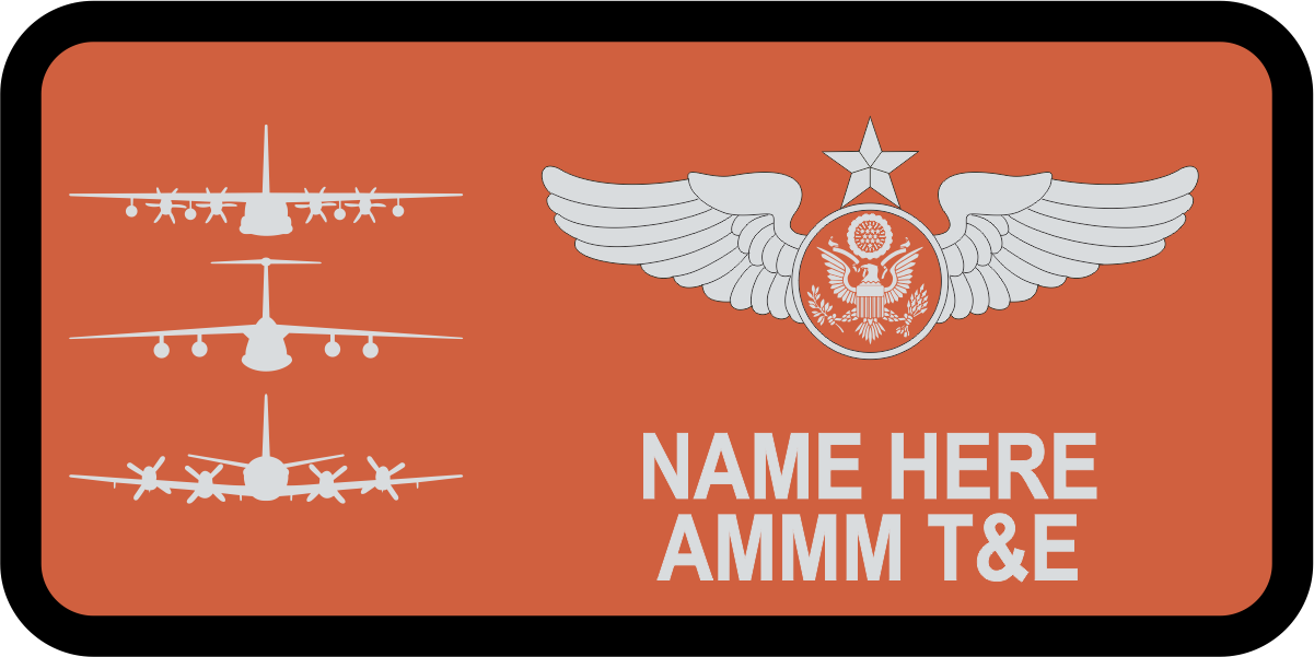 Lockheed Martin Marietta Test & Eval C-130J, C-5, & P-3 Name Tag- Orange Background, Black Border, Light Gray Wings & Text, with C-130, C-5, P-3 Light Gray