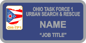 Ohio Task Force 1 Name Tag - Navy Blue Background, Gray Border, Ohio State Flag on the Left, Ohio Task Force 1 Urban Search & Rescue, Helicopter Search & Rescue