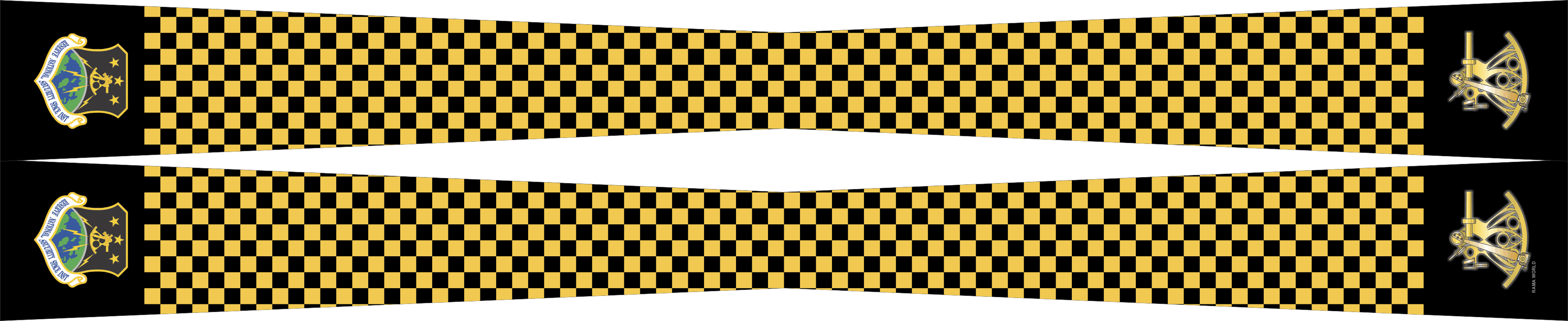 Schriever AFB Colorado Springs Flight Scarf - Black and gold checkered pattern body with a sextant on one end and the RNSSI patch on the other end.