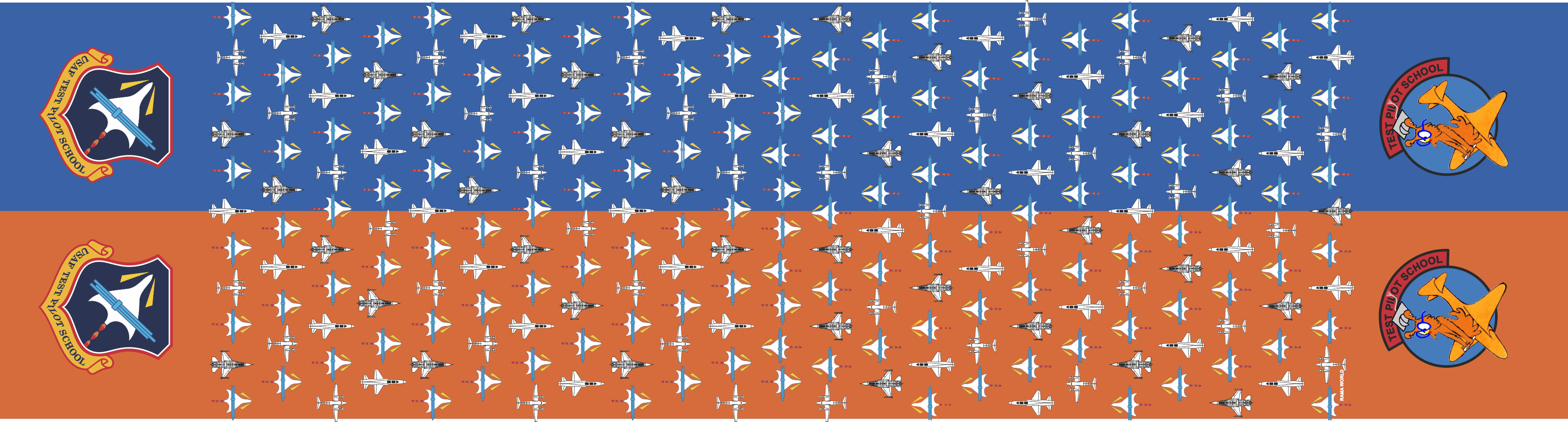 Edwards AFB TPS AF Blue and Orange Flight Scarf With TPS Emblem, F-16, T-38, C-12 Aircrafts Through-Out and SQ Patches on the Ends of the Scarf. Size: 6" x 48".